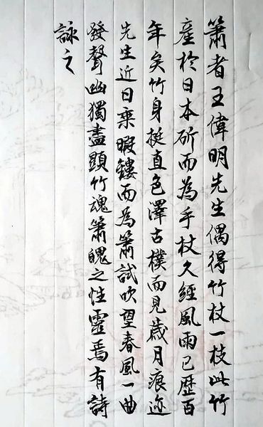 是奇緣也!秀竹手杖,寄塵扶桑,扶持步履,解困人寰;飽覽無限風光,盡嚐幾許滄桑;歷練百年,飄洋中土一隅,遇王偉明君鏤刻為簫,冀以清音滌慮,頤養心神。